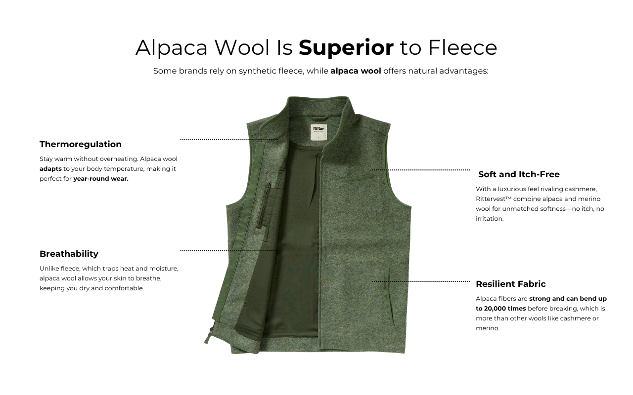 Pilling-Resistant: Unlike fleece, alpaca fibers resist pilling, keeping your vest looking sharp even after repeated use.